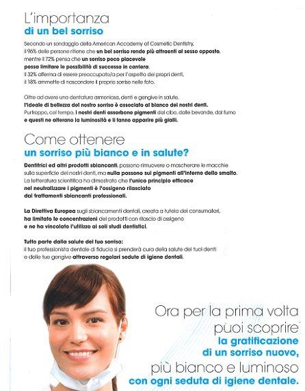 Grazie agli igienisti professionali del centro odontoiatrico, potrà sottoporsi a costanti sedute di igiene dentale. L’igiene dentale professionale è un intervento di pulizia profonda dei denti che si svolge in ambulatorio dentistico almeno 2 volte l’anno, per garantire la completa rimozione del tartaro ed evitare la formazione della placca. L’igiene dentale quotidiana, messa in atto a casa almeno due volte al giorno, è il primo passo per avere una bocca sana e mantenere i propri denti in salute, ma, a differenza dell’igiene dentale professionale, non evita la formazione di tartaro sotto il bordo gengivale. Per questo è importante sottoporsi a sedute di detartrasi dal proprio dentista di fiducia periodicamente.